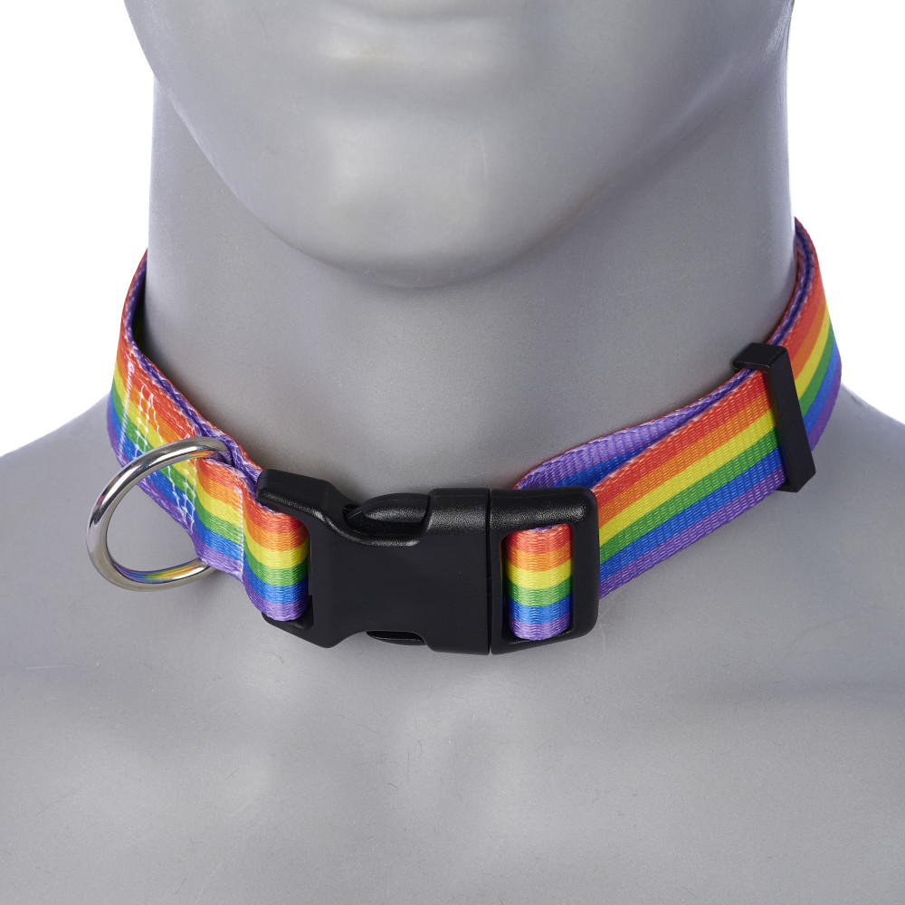 Like our giant fursuit pride collars, but don't have a fursuit? Now introducing a smaller collar sized appropriate for humans or pets! This collar is just 1" wide and adjusts between 13" and 19". It is equipped with a large D-ring for attaching badges or tags to as well.